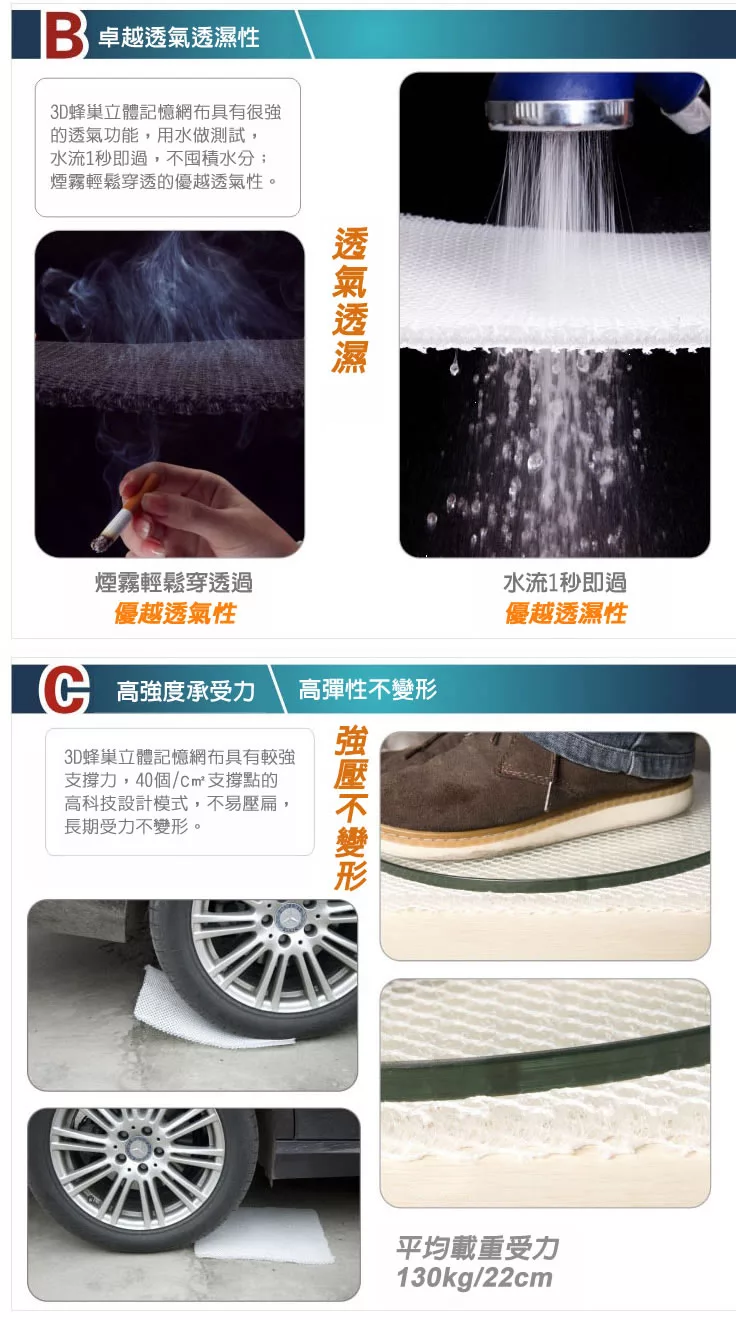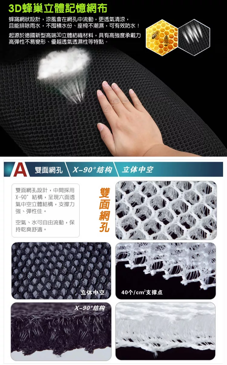 3D蜂巢立體記憶網布,支撐力強、彈性佳,提供絕佳的舒適感