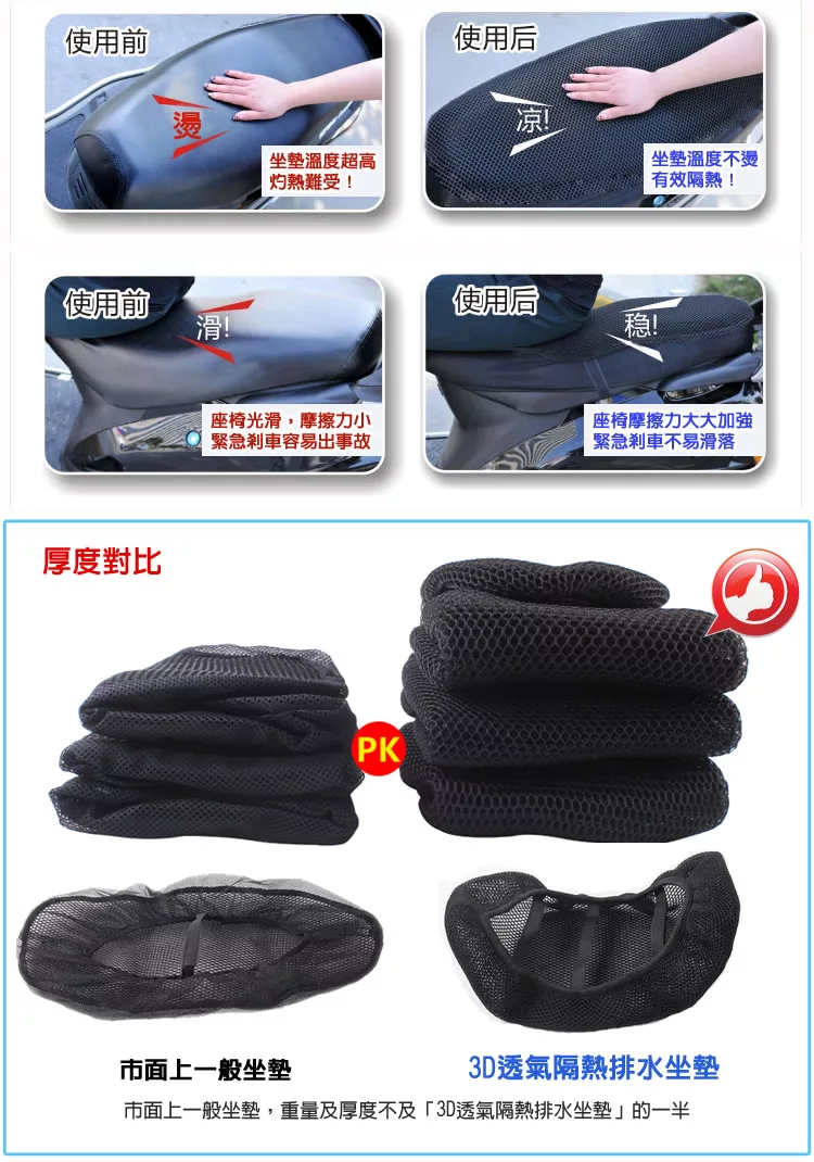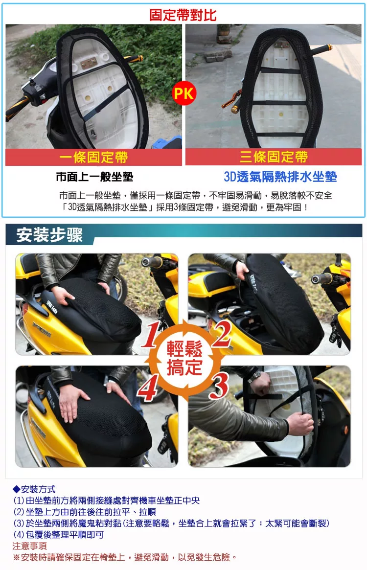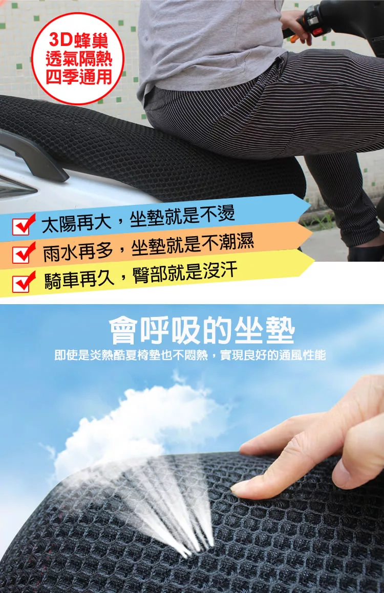 機車族們免苦惱!使用【3D透氣隔熱排水機車坐墊】不酷熱、不悶濕,給您完全清爽的騎乘