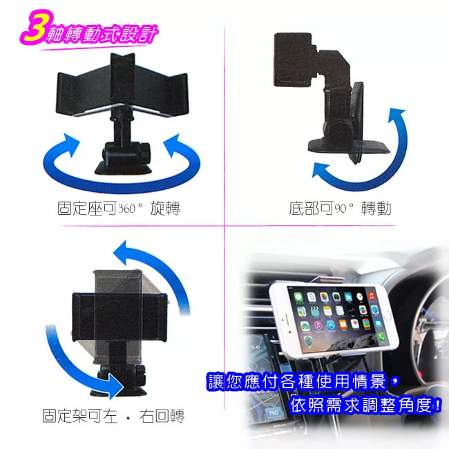 3軸轉動式設計可讓您應付各種使用情景,依照您的需求調整角度;手機座部分360°的旋轉功能,更是可以讓您在直看、橫看中變化自如!!